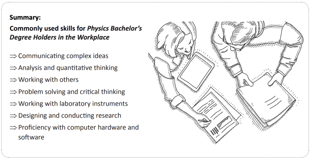 Important notes about this list: Each entry on this short list should be considered as a “set” of skills. You may have several specific skills that fall into a particular skill set ‘category’. Also note that this list is not exhaustive. There are a number of other important skills that you might possess and that may be useful to a potential employer. This list represents data obtained by surveying physics bachelor’s degree holders who have entered the workplace, and should be considered as a starting point.