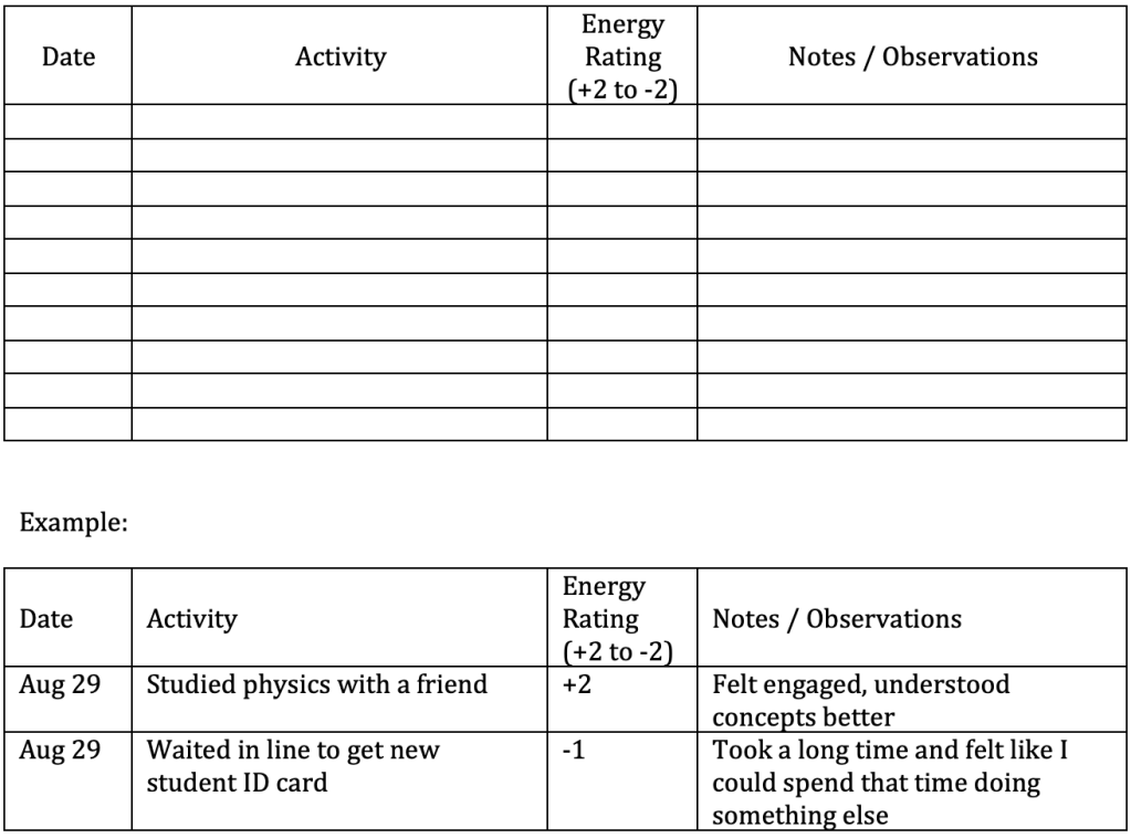 Last week you began thinking about your physics origin story and what it means to design your own path. This week we’ll dig into the first Design Your Life tool: Energy Mapping. The goal is simple — start paying attention to how your daily activities affect your energy and engagement. This awareness will help you make better decisions about your time, your commitments, and your future in physics.