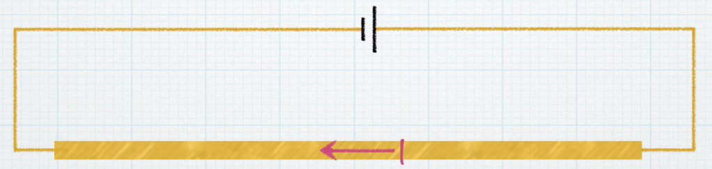 We know that the conventional current will flow in this clockwise direction based on the orientation of the battery. And we also know that the particles that carry the charge are the electrons because electrons can move freely in a conductor. But in the 1800s, people didn’t know this. (This was before people even knew that electrons existed!) People at this time asked the question: Is this current (I) due to positive charges moving to the left or negative charges moving to the right?
