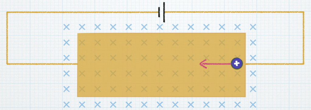 Let’s walk through this experiment. Hall replaced the wire with a conducting ribbon, which is like a wire only flat and wide. And then he placed that conducting ribbon in a uniform magnetic field (represented by the X’s in the picture below — think: what is the direction of B?). When he connected the battery, a current flowed through the ribbon. He wanted to know, is this current made from positive charges moving to the left: