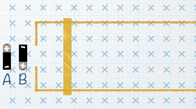 The figure shows a top view of two conducting rails on which a conducting bar can slide. A uniform magnetic field is directed perpendicular to the plane of the figure as shown (into the page, X). A battery is to be connected to the two rails so that when it’s connected, current will flow through the bar and cause a magnetic force to push the bar to the right. In which orientation, A or B, should the battery be placed in the circuit to result in a magnetic force on the bar that pushes it to the right?