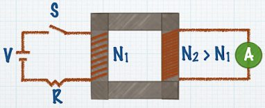 An ideal transformer is shown below. The current in the primary circuit is 10 mA. The primary circuit has 4 turns, the secondary circuit has 8 turns. What is the current in the secondary circuit.
