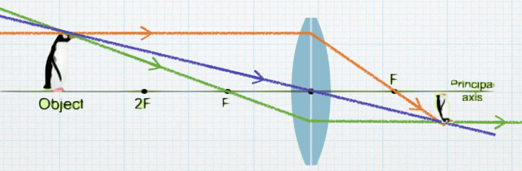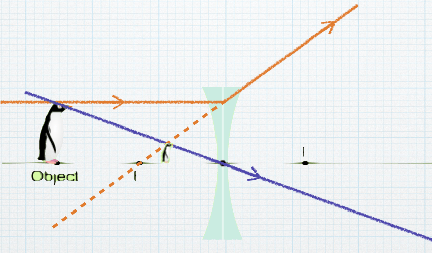 - Draw a ray that starts at the top of the object and goes through the focal point on the object-side of the lens. When this reaches the lens, it will bend so that it exits the lens parallel to the optical axis. (Remember how lenses are symmetrical.)