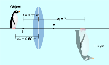 Given the object distance and focal length of the converging lens in the figure, determine the image distance.