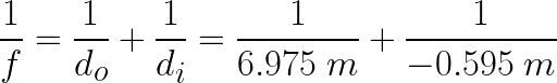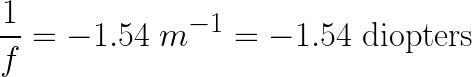 The power of the corrective lenses is equal to the inverse of the focal length measured in meters. Use the thin lens equation to determine the inverse of the focal length, or the power of the corrective lenses: