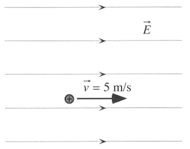 At the instant shown, a positively charged particle is moving at 5 m/s in the direction of a uniform electric field. Someone makes the following statement: “As the particle continues to move in the direction of the electric field, the particle will gain potential energy since it is moving in the direction of increasing electric potential energy.”