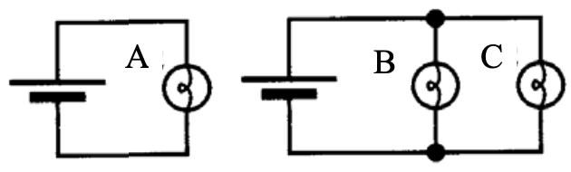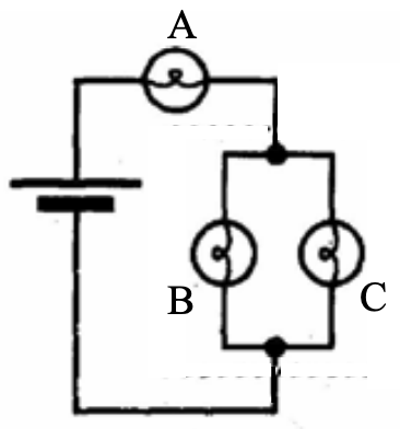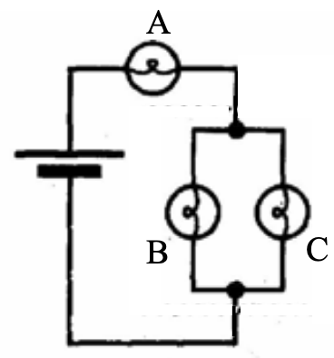 “B and C are equally bright but dimmer than A. B and C have to share the current whereas A gets all of it.”