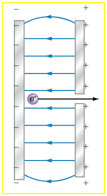 A simple and common technique for accelerating electrons is shown in the figure, where there is a uniform electric field between two plates. Electrons are released, usually from a hot filament, near the negative plate, and there is a small hole in the positive plate that allows the electrons to continue moving.![]() |