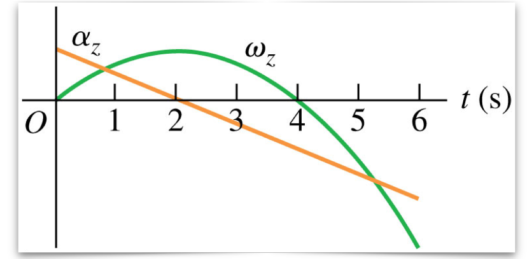 ![]() The graph shows the angular velocity ω and angular acceleration α versus time t for a rotating body. At which of the following times is the rotation speeding up at the greatest rate? |