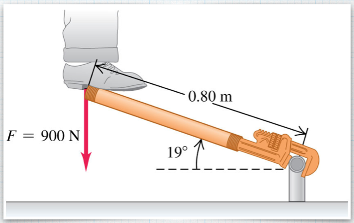 ![]() A plumber pushes straight down on the end of a long wrench as shown. What is the magnitude of the torque he applies about the pipe at lower right? |