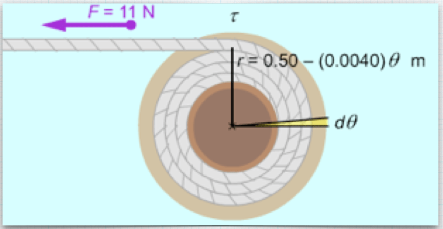 A rope pulls on a spool with a constant force, causing it to rotate. As the spool rotates, the rope rolls off. (The distance r changes as the rope comes off the spool.) How much work is done during the first rotation of the spool?