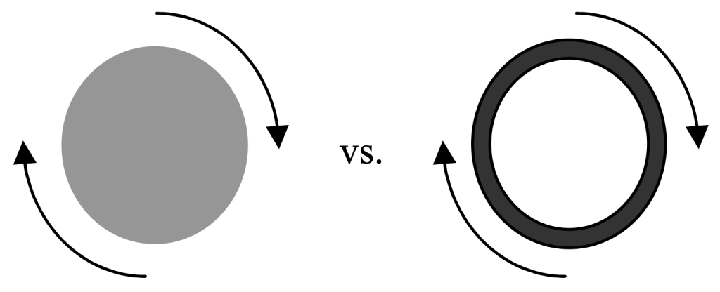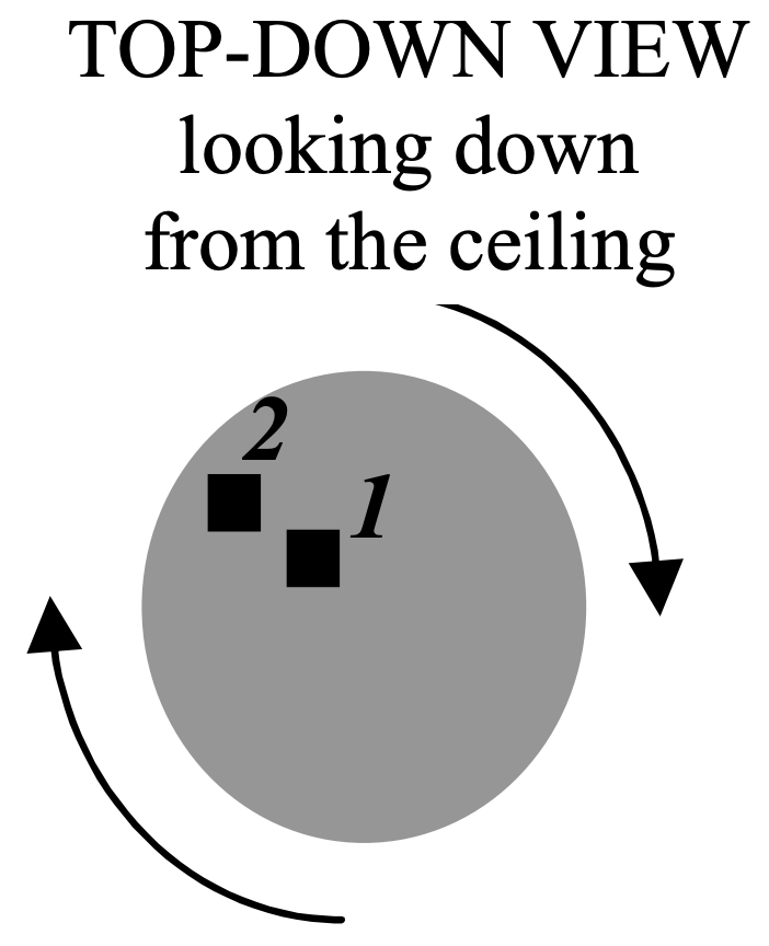 A. (Work together) Again consider a hockey puck spinning in place on ice. In this diagram, we’ve labeled two equally-massive “pieces” of the puck, 1 and 2. Which of those two pieces, if either, “contributes” more to the puck’s rotational kinetic energy? In other words, which piece (if either) has more kinetic energy? Explain.