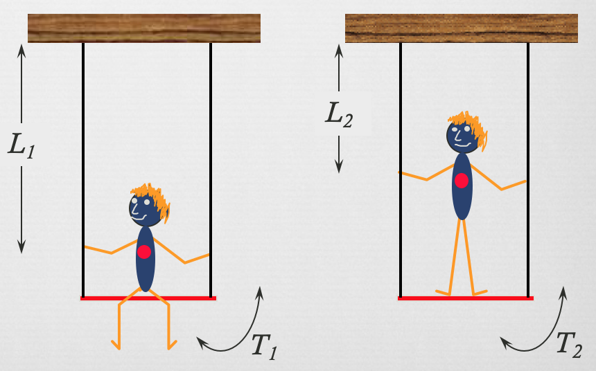 ![]() You are sitting on a swing. A friend gives you a small push and you start swinging back & forth with period T1. Suppose you were standing on the swing rather than sitting. When given a small push you start swinging back & forth with period T2. Which of the following is true: |