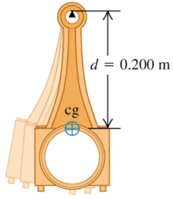 A 1.80-kg connecting rod from a car engine is pivoted about a horizontal knife edge as shown in the figure. The center of gravity of the rod was located by balancing and is 0.200 m from the pivot. When it is set into small amplitude oscillation, the rod makes 100 complete swings in 120 s. Calculate the moment of inertia of the rod about the rotation axis through the pivot.
