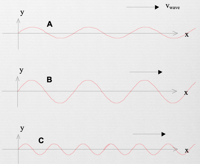 Three waves are traveling along identical strings. Wave B has twice the amplitude of the other two. Wave C has 1/2 the wavelength than A or B. Which wave, B or C, carries more energy per time (power)?