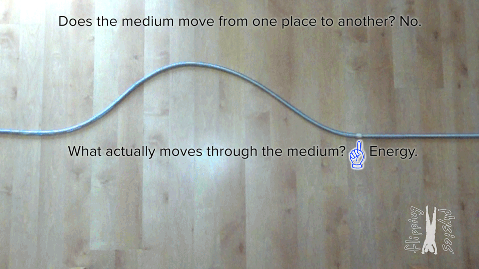 The wave travels through a medium (the people are the particles that make up the medium). What’s important to note here is that the particles move up and down (the people stand and then sit) as the wave pulse travels horizontally. The wave is a disturbance and you can watch this disturbance travel — or propagate — through the medium.