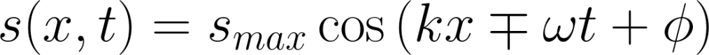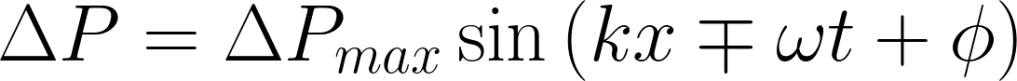 This equation is similar to the periodic wave equations seen in Module 14, where ΔP is the change in pressure, ΔPmax is the maximum change in pressure, k = 2π/λ is the wave number, ω = 2π/T= 2πf is the angular frequency, and ϕ is the initial phase.