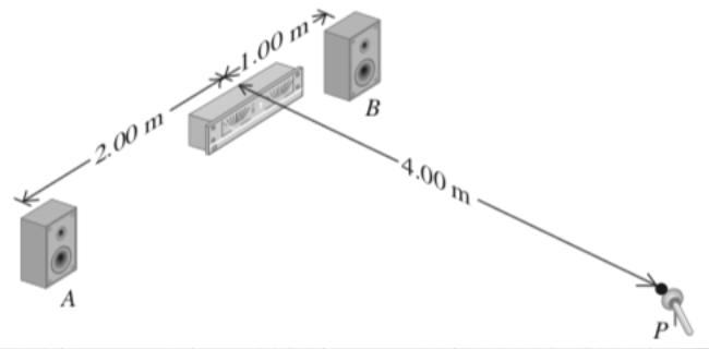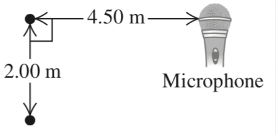Two small stereo speakers (black dots) are driven in step by the same variable-frequency oscillator. Their sound is picked up by a microphone arranged as shown. For what frequencies does their sound at the microphone produce (a) constructive interference and (b) destructive interference?