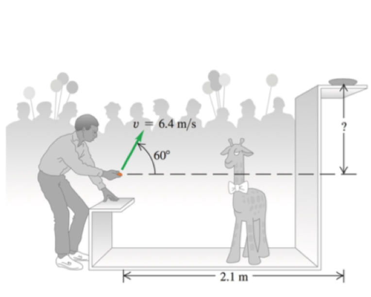 In a carnival booth, you can win a stuffed giraffe if you toss a quarter into a small dish. The dish is on a shelf above the point where the quarter leaves your hand and is a horizontal distance of 2.1 m from this point. If you toss the coin with a velocity of 6.4 m/s at an angle of 60° above the horizontal, the coin will land in the dish. Ignore air resistance.