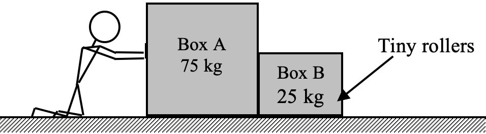 A student pushes two boxes, one in front of the other, as shown in the diagram. Box A has mass 75 kg, while box B has mass 25 kg. Fortunately for the student, the boxes are mounted on tiny rollers and slide with negligible friction. The student exerts a 200 N horizontal force on box A.