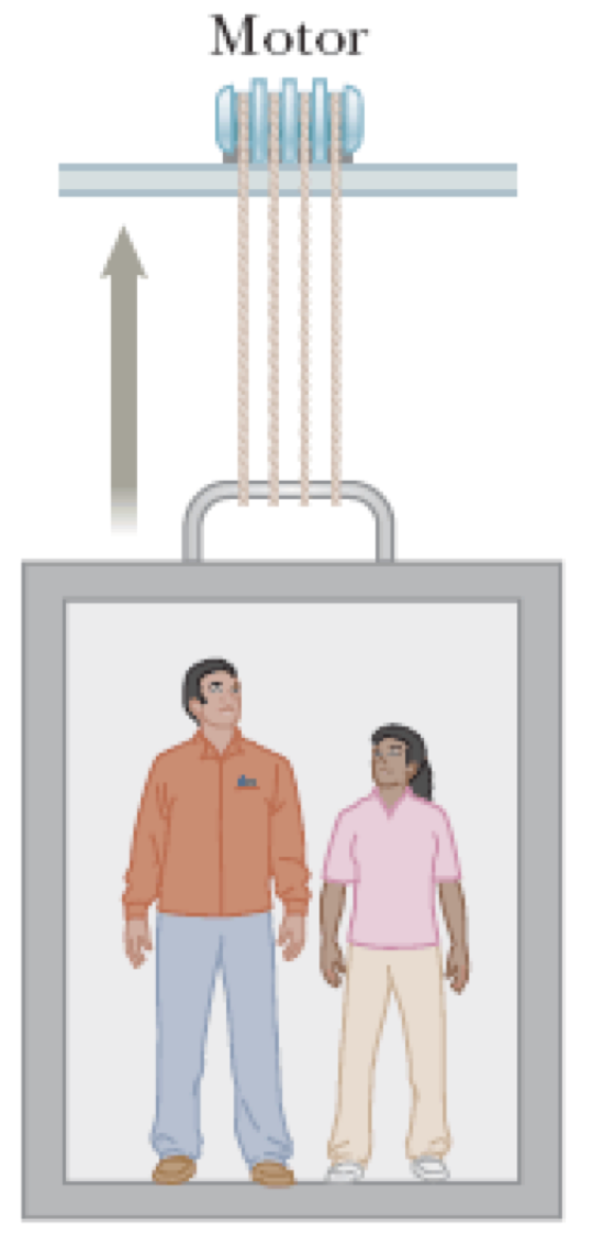 An elevator car (see figure) has a mass of 1008 kg and is carrying passengers having a combined mass of 874 kg. A constant friction force of 4084 N opposes its motion. The elevator descends at 3.0 m/s. What is the power delivered by the motor? (Energy must be removed to slow the elevator’s descent.)