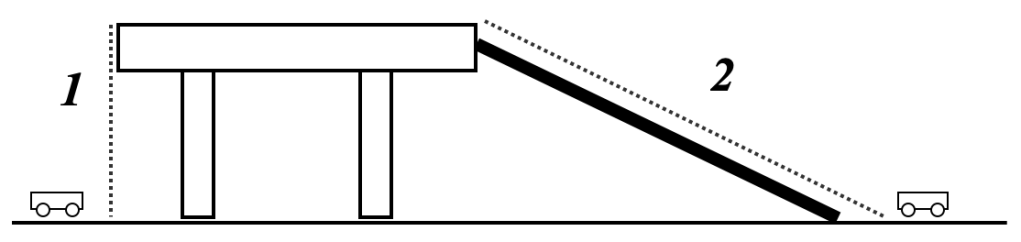 A lazy professor wants to lift a cart from the floor onto a table. She can either lift it straight up along path 1, or she can push it up the ramp along path 2 (see the dashed lines in the diagram). If she chooses path 2, the cart rolls with negligible friction. Whichever path she chooses, the cart starts at rest on the floor and ends at rest on the table. Here’s the issue: Along which path will the professor do less work on the cart?