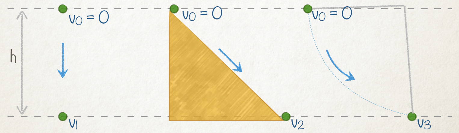 ![]() Three objects of mass m begin at height h with zero velocity. One falls straight down, one slides down a frictionless inclined plane, and one swings on the end of a pendulum. What is the relationship between their velocities when they have fallen to a final height of zero? |