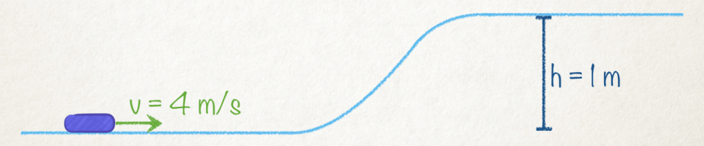 A hockey puck slides without friction along a frozen lake toward an ice ramp and plateau as shown. The speed of the puck is 4 m/s and the height of the plateau is 1 m. Will the puck make it all the way up the ramp?