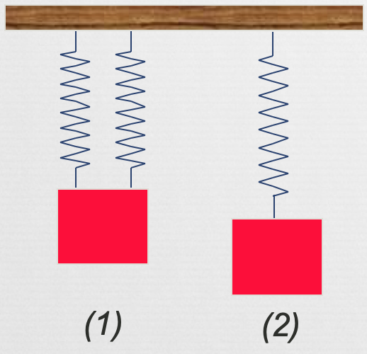![]() All springs and masses shown are identical. (Gravity acts downward). Which of the systems below has the most potential energy stored in its spring(s), relative to the relaxed position? |