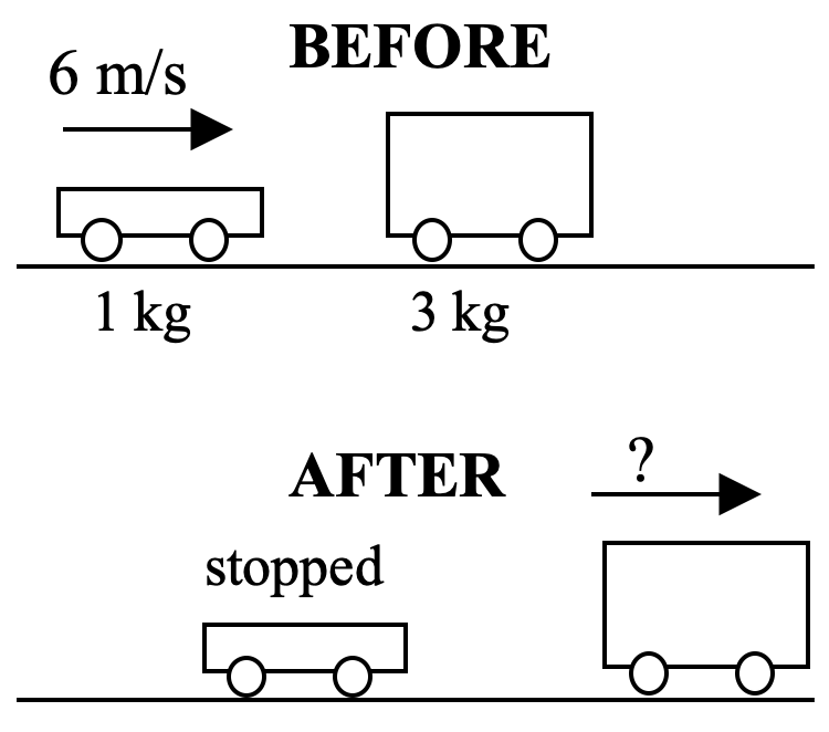 B. (Work together) In a similar experiment, the 1 kg cart collides with a 3 kg cart but doesn’t stick to it. Instead, the 3 kg cart gets knock forward by the 1 kg cart, which comes to rest after the collision.