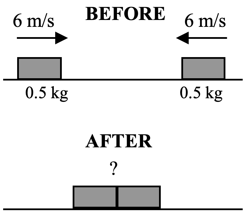D. Let’s look at one more collision. Two identical blocks, both of mass 0.5 kg and covered with Velcro™, slide toward each other at equal speeds, 6 m/s. The blocks stick together.
