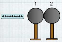 ![]() Two uncharged metal spheres located on top of insulating poles are initially in contact as shown. A positively charged insulator is brought close to sphere 1 without touching and then the spheres are separated before the positively charged insulator is removed. |