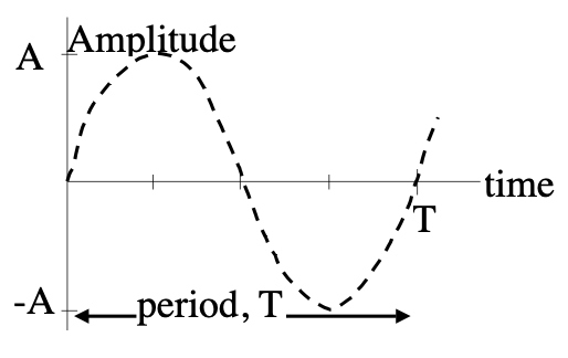 Let’s start with the stuff related to time. We can look at a transverse wave and watch how a point on that wave moves up and down in time. How far it moves up and down from the equilibrium position is called the amplitude, A.
