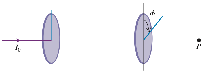 Light of original intensity I0 passes through two ideal polarizing filters having their polarizing axes oriented as shown. You want to adjust the angle φ so that the intensity at point P is equal to I0/10.