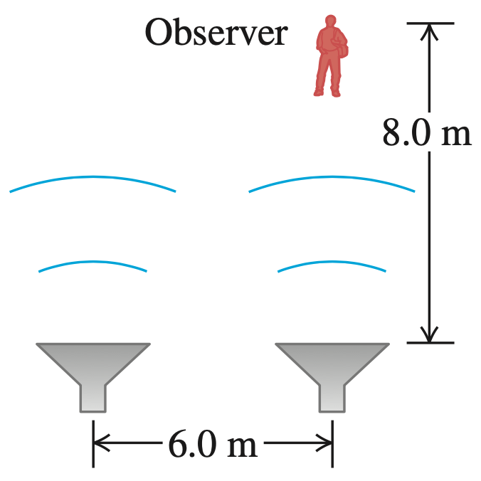 (a) At the observer’s location, what is the path difference for waves from the two speakers?
