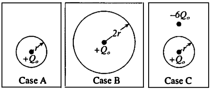 D. The three spherical Gaussian surfaces at right each enclose a charge +Q0. In case C there is another charge -6Q0 outside the surface.
