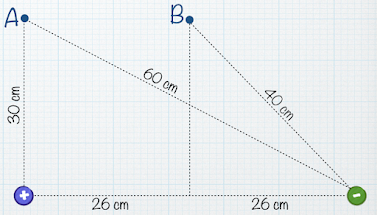 A positive charge and a negative charge are at rest with a distance of 52 cm between them.![]() What is the electric potential at point B? |