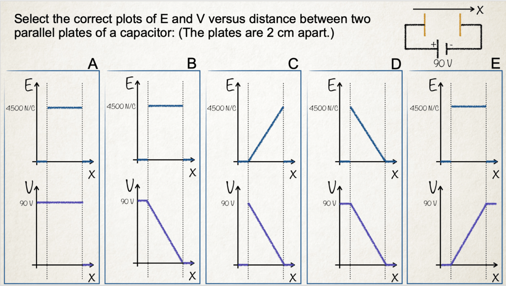 Select the correct plots of E and V versus distance between two parallel plates of a capacitor.