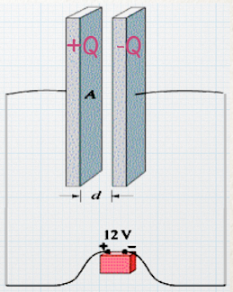This parallel-plate capacitor is connected to a battery and has been fully charged. The +Q and -Q represent the amount of charge that the battery moved from one plate to the other. Both plates start out neutral before being connected to the battery. The +Q on the left plate arises from removing -Q and the -Q on the right plate comes from adding the -Q that was removed from the left plate. This means the plates will ALWAYS have the same amount of charge, just opposite in sign. We describe the geometry of the parallel-plate capacitor in terms of the size of each plate and the spacing: A is the area of a plate (the plates are almost always the same size as each other) and d is the separation distance.
