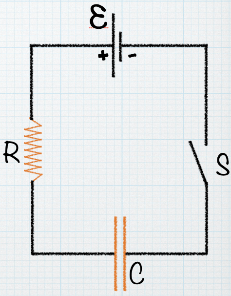 In this circuit we have a battery that provides an emf, a switch that allows us to close the circuit and charge the capacitor, a capacitor and a resistor in series. Let’s assume the capacitor is not charged yet. When we close the switch, then the battery will move charge from one capacitor plate to the other and that moving charge (current) will flow through the resistor.