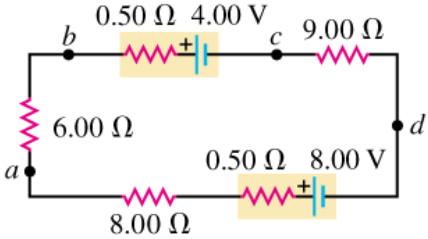 (c) A battery with emf 10.30 V and internal resistance 0.50 Ω is inserted in the circuit at d, with its negative terminal connected to the negative terminal of the 8.00-V battery. What is the difference of potential Vbc between the terminals of the 4.00-V battery now?