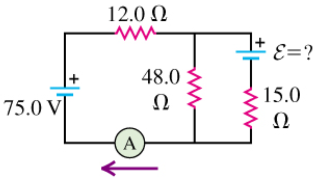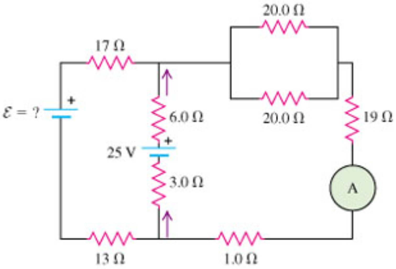 In the circuit shown in the figure, both batteries have insignificant internal resistance and the idealized ammeter reads 1.40 A in the direction shown.