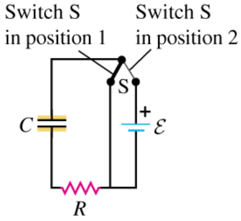 In the circuit shown in the figure, C = 5.90 µF, = 28.0 V, and the emf has negligible resistance. Initially the capacitor is uncharged and the switch S is in position 1. The switch is then moved to position 2, so that the capacitor begins to charge.