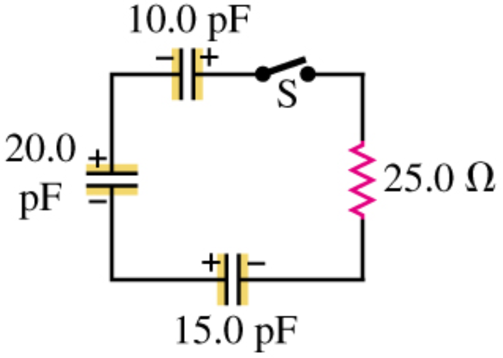 In the circuit shown in the figure, each capacitor initially has a charge of magnitude 3.60 nC on its plates. After the switch S is closed, what will be the current in the circuit at the instant that the capacitors have lost 80.0% of their initial stored energy?