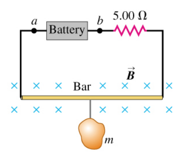 The circuit shown in the figure is used to make a magnetic balance to weigh objects. The mass m to be measured is hung from the center of the bar, that is in a uniform magnetic field of 1.50 T, directed into the plane of the figure. The battery voltage can be adjusted to vary the current in the circuit. The horizontal bar is 60.0 cm long and is made of extremely light-weight material. It is connected to the battery by thin vertical wires that can support no appreciable tension; all the weight of the suspended mass m is supported by the magnetic force on the bar. A resistor with R = 5.00 Ω is in series with the bar; the resistance of the rest of the circuit is much less than this.