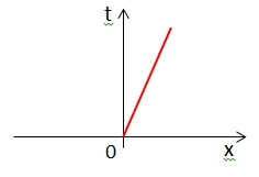 | Which world line (in red) represents an object moving to the right at constant velocity along the x axis? |