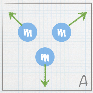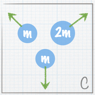| A stationary nucleus of mass 3m decays into smaller nuclei. The masses of the smaller nuclei are given in the figures. The green arrows represent the velocities of the smaller nuclei. Which of the following represents a possible final state? |