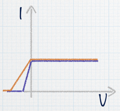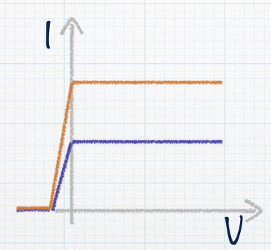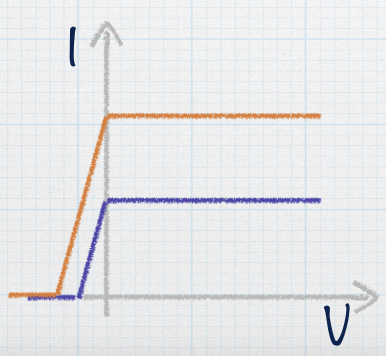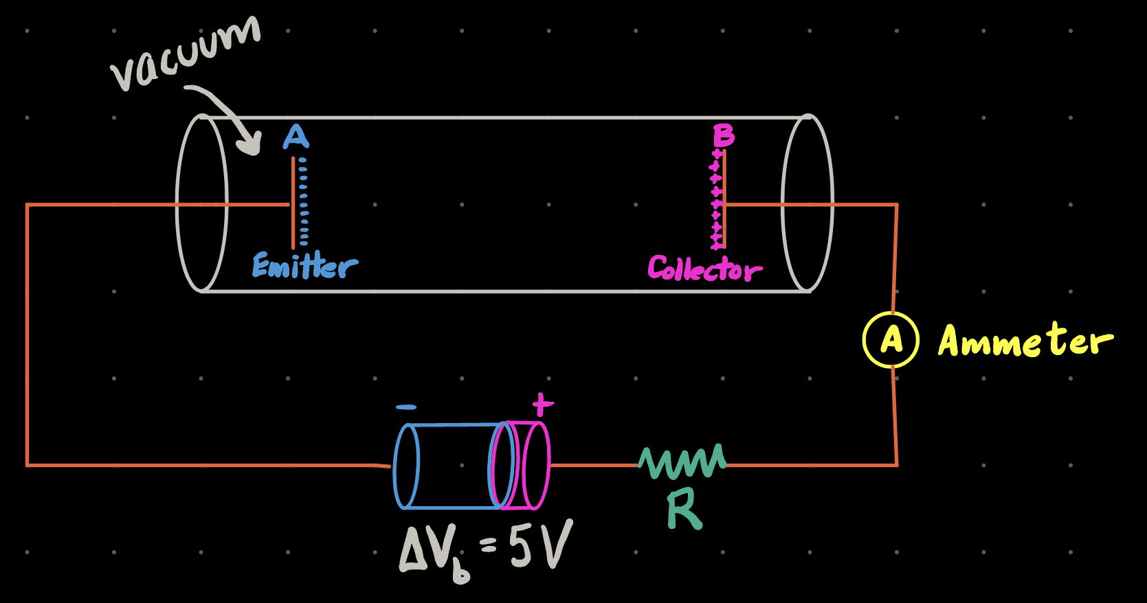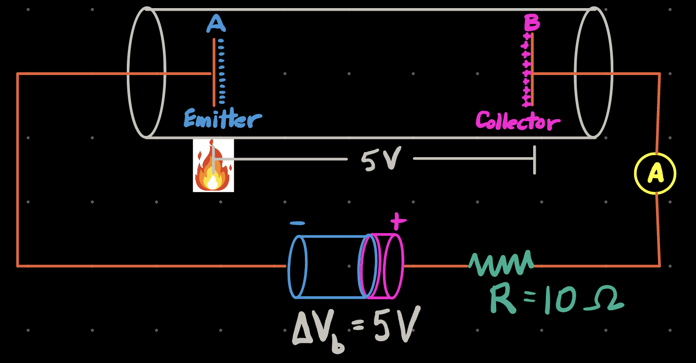 Heat up plate A until it’s just hot enough to barely “burn off” some electrons. (This is called thermionic emission.) What will a graph of current vs. voltage look like?