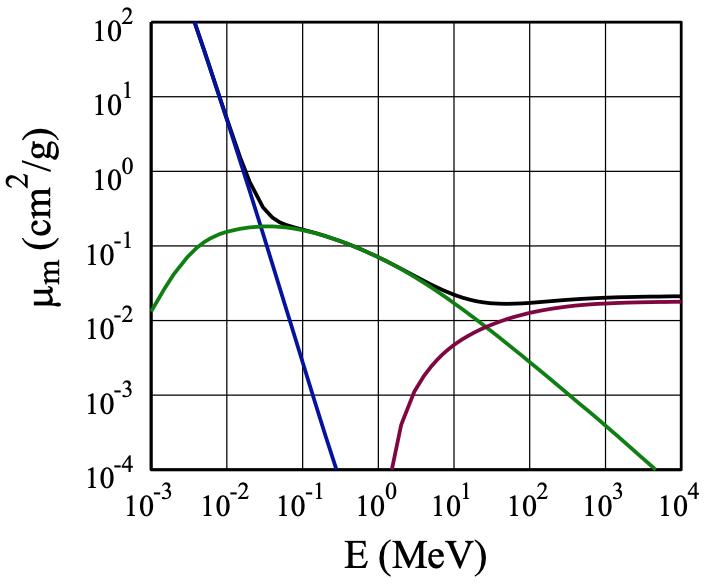 The figure below shows the mass attenuation coefficient for gamma rays and x rays in tungsten. The black line is the total attenuation coefficient, and each of the colored lines is the contribution to the attenuation coefficient due to each of the different ways that the gamma rays and x rays interact with matter.
